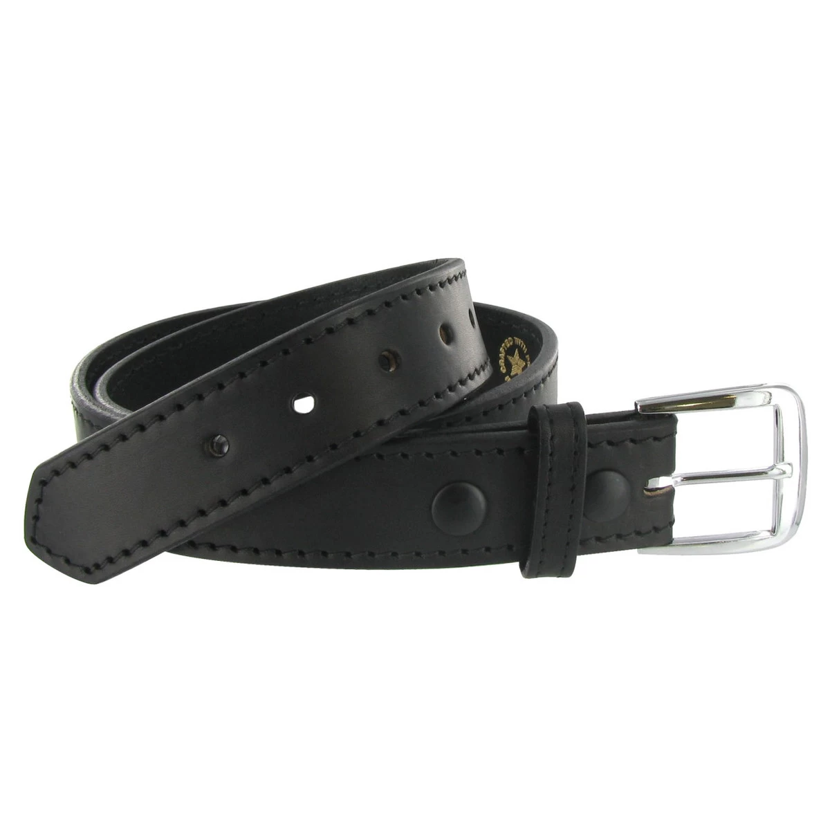 Made from full grain English bridle leather, the Stitched Edge from Boston Leather is drum dyed to prevent cracking and peeling, which greatly prolongs the life of the belt. Each belt is also outfitted with 7 tip holes instead of 5 to accommodate more sizes. Solid brass snaps and staples prevent rusting, and each buckle can be removed and replaced with one of your choice.