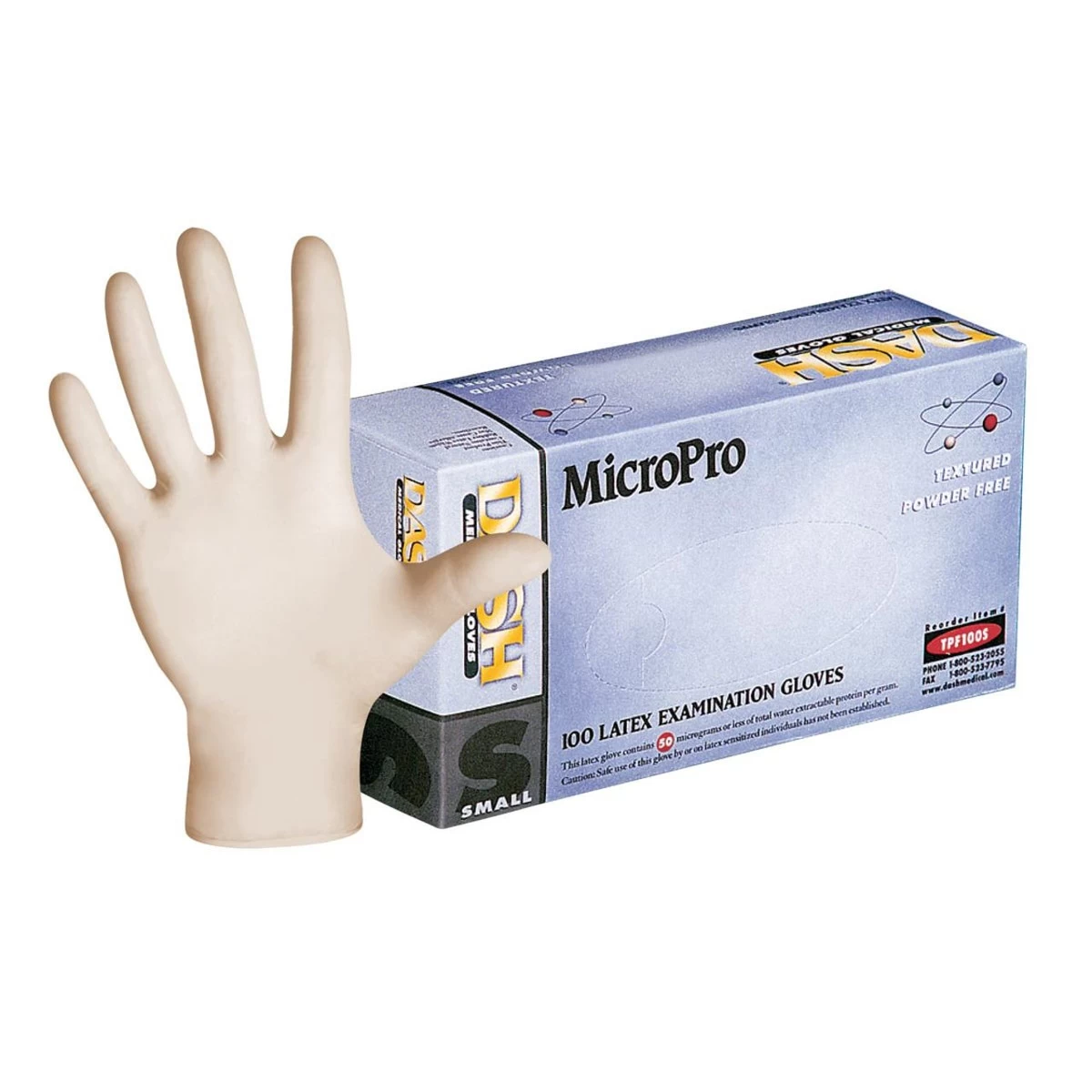The Dash MicroPro TPF100 Latex Exam Gloves high quality, low modulus latex provides a comfortable and form fitting glove. Micro textured surface extends from the finger all the way through the palm delivering an enhanced grip in wet or dry conditions.