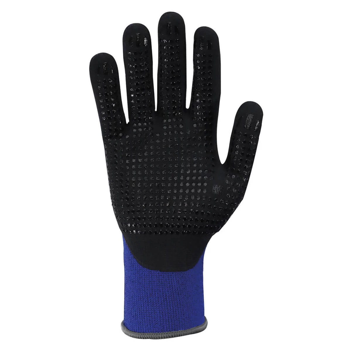 The General Electric Dotted Palm Micro Foam Nitrile Coated Gloves are designed for various applications, including general maintenance, gardening, manufacturing, material handling, and automotive. These gloves are made of high-quality nitrile, which provides superior protection and durability. The micro-foam palm coating provides excellent grip in wet and dry conditions, and the dotted palm pattern helps to reduce fatigue. The elastic cuff ensures a secure fit, and the black and blue color scheme ensures visibility in low-light conditions. These gloves are comfortable to wear and provide superior protection and performance.