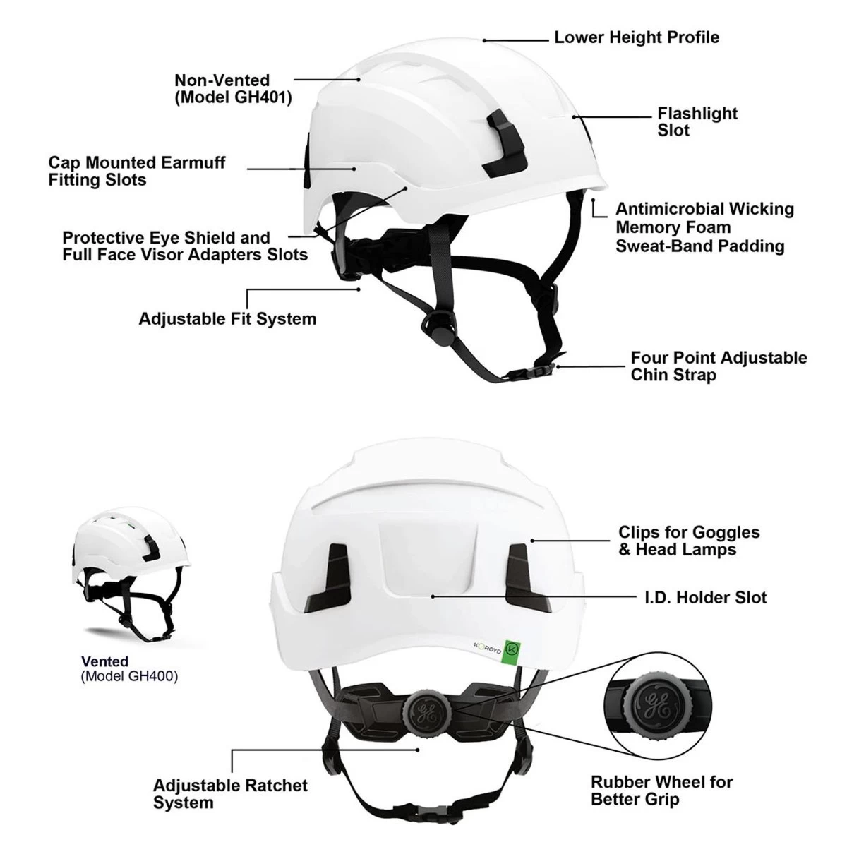 By innovating beyond EPS foam, the GH401 reduces two common pain points in helmet design: the weight and the height profile of the helmet. Heat stress, weight, and height profile are the most common reasons users remove their helmets while working, creating the potential for injury. The GH401 provides a lightweight, efficient, and complete Type 1 safety helmet with increased user comfort, a low profile, and an array of accessories available to meet any needs.