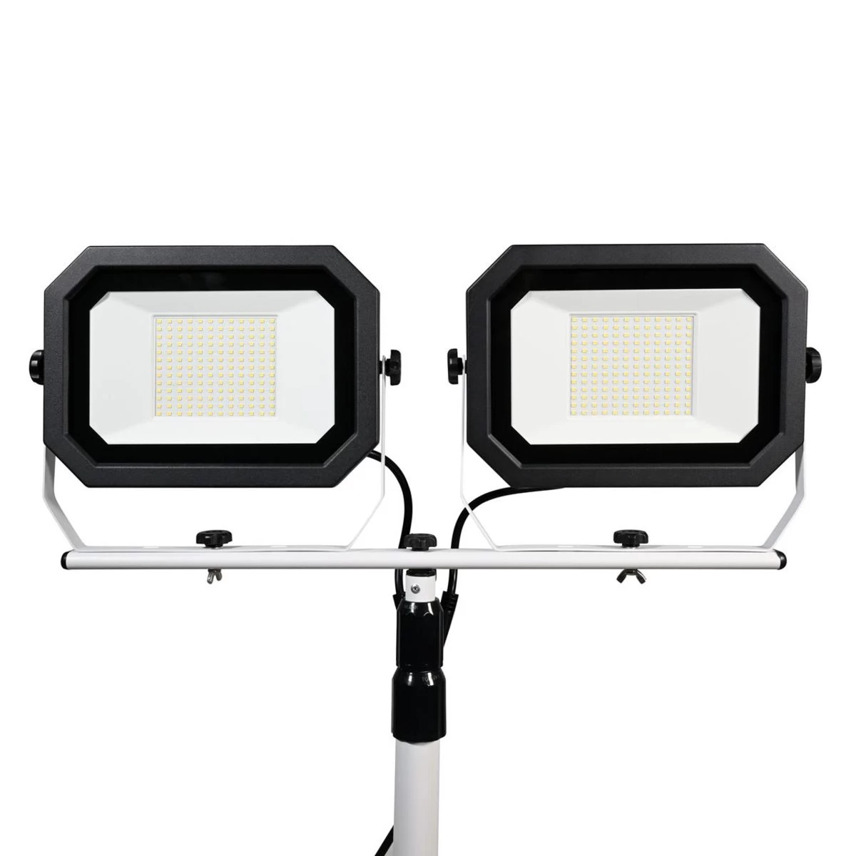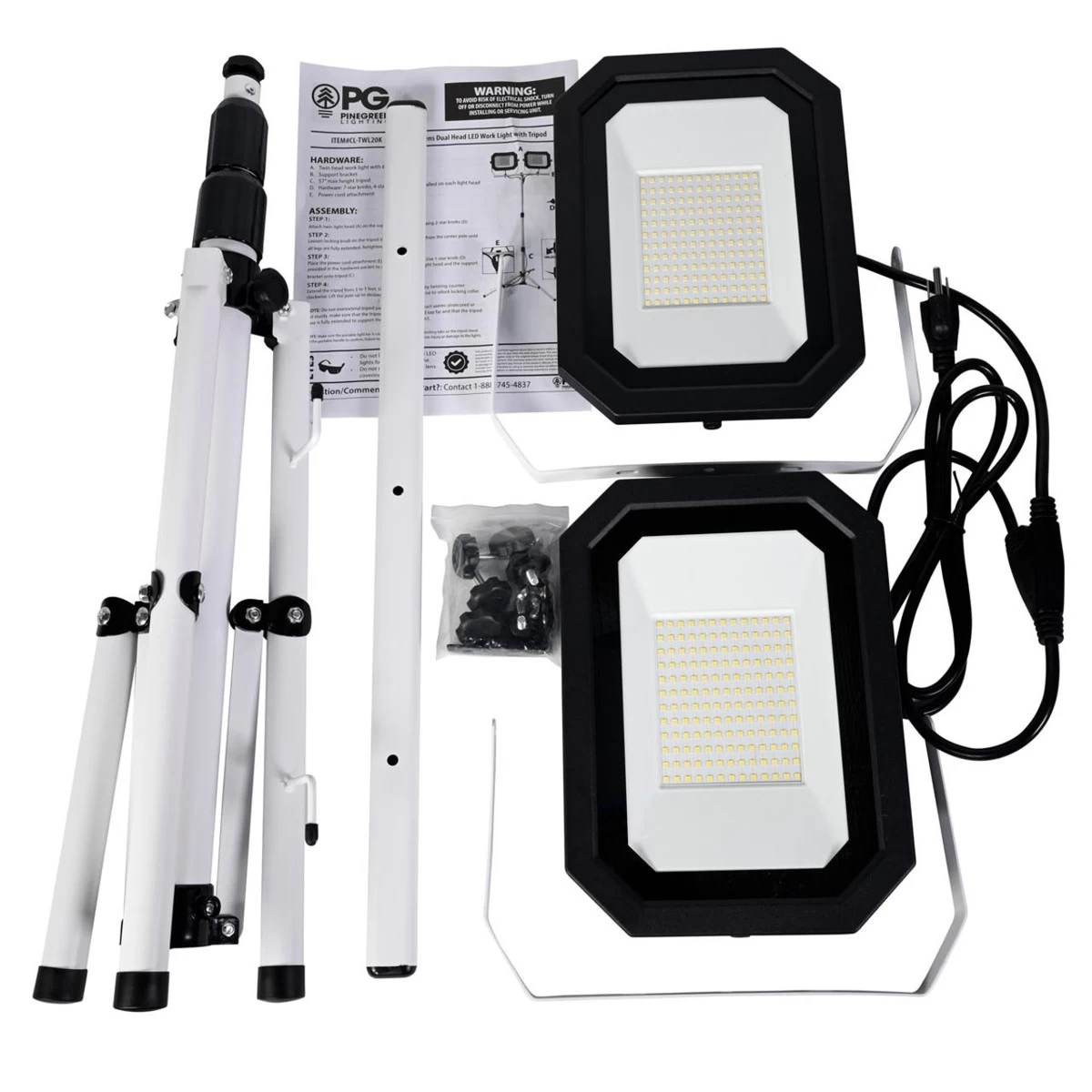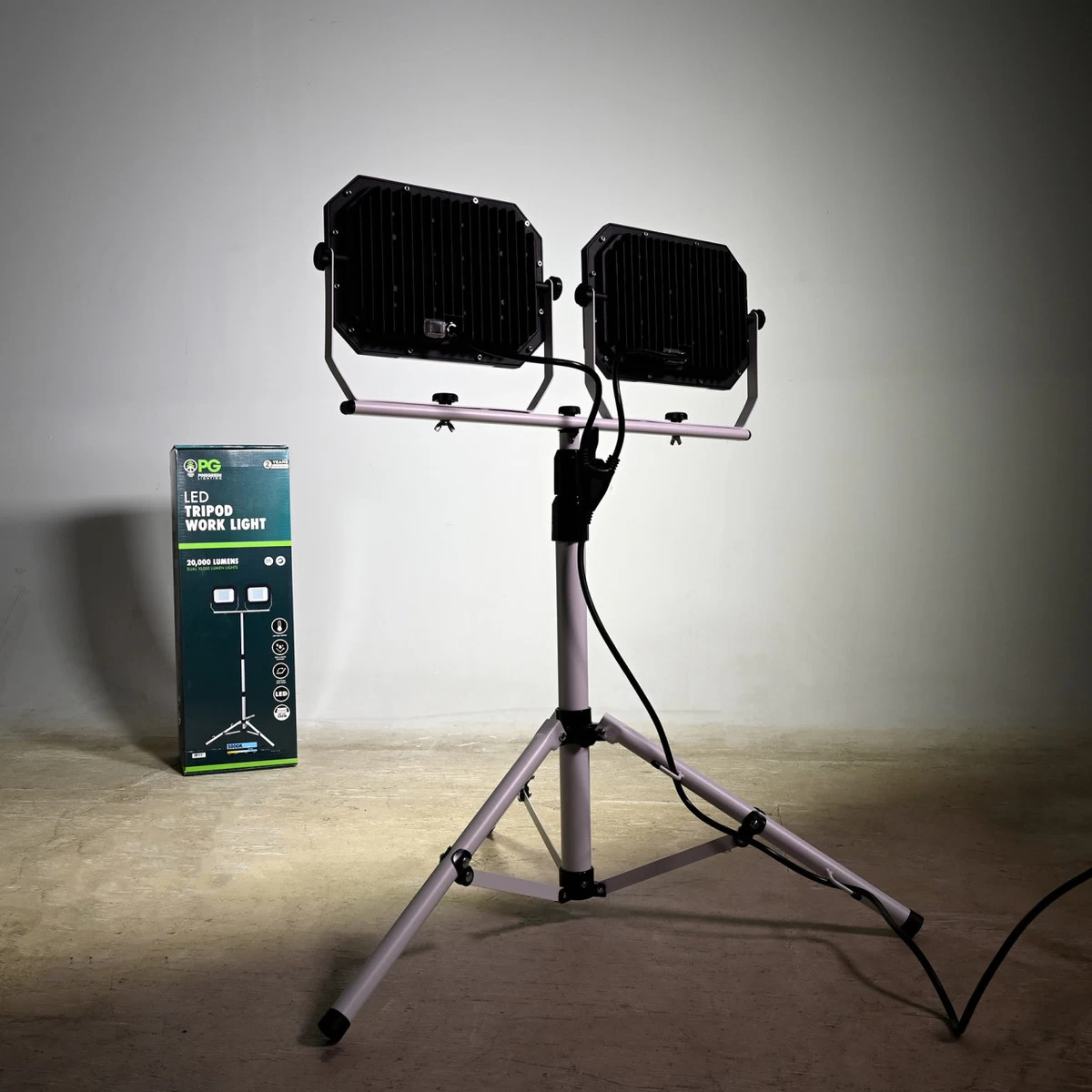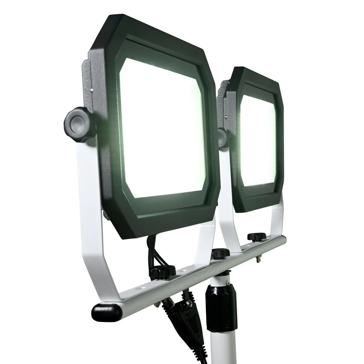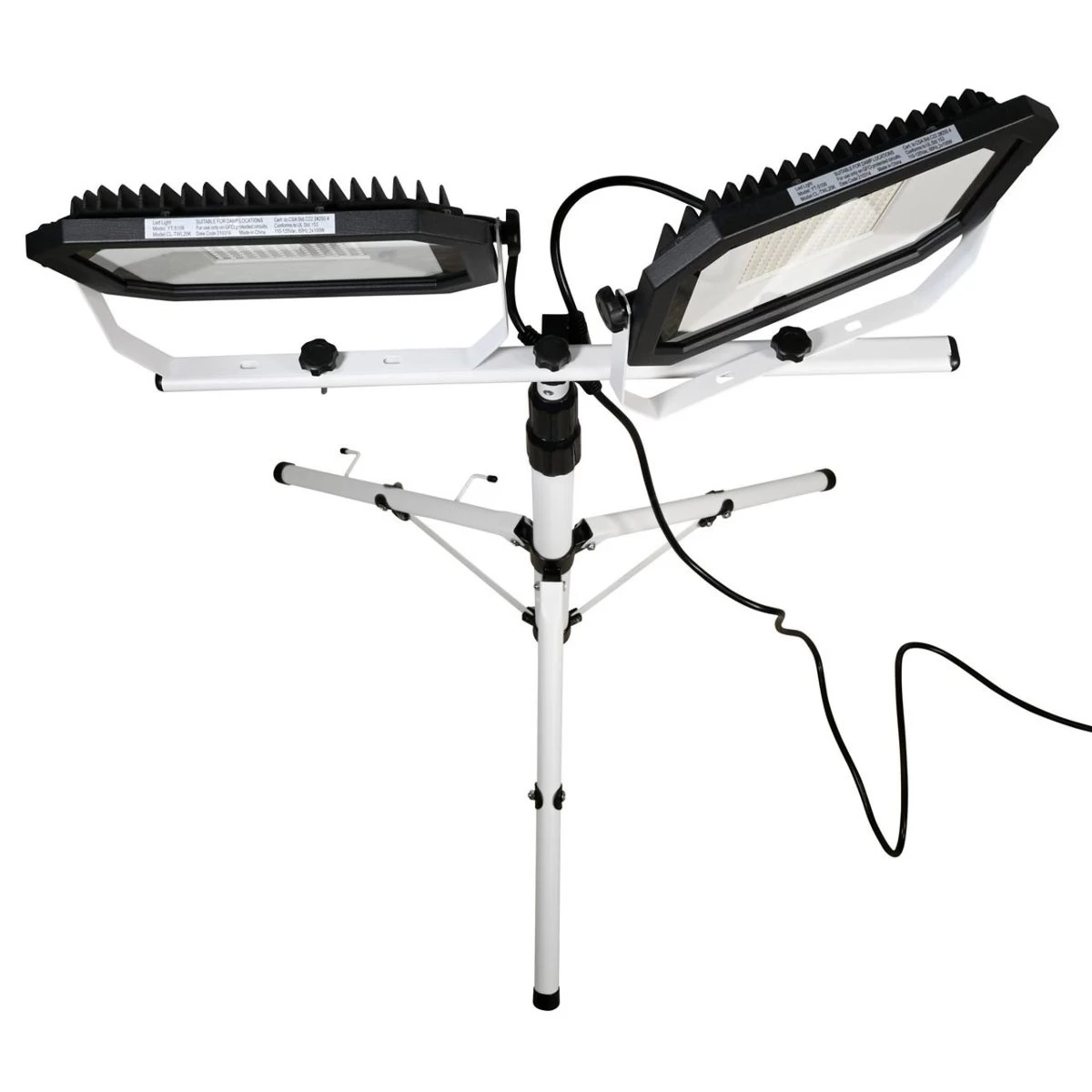 Lightup your workspace with this Tripod Dual-Head LED Work Light. Perfect for any projects which requires bright even light such as job sites where hardwired fixtures are not installed, painting rooms, garage work, and many more applications. It offers excellent heat dissipation allowing the light to operate cooler than traditional halogen work lights.