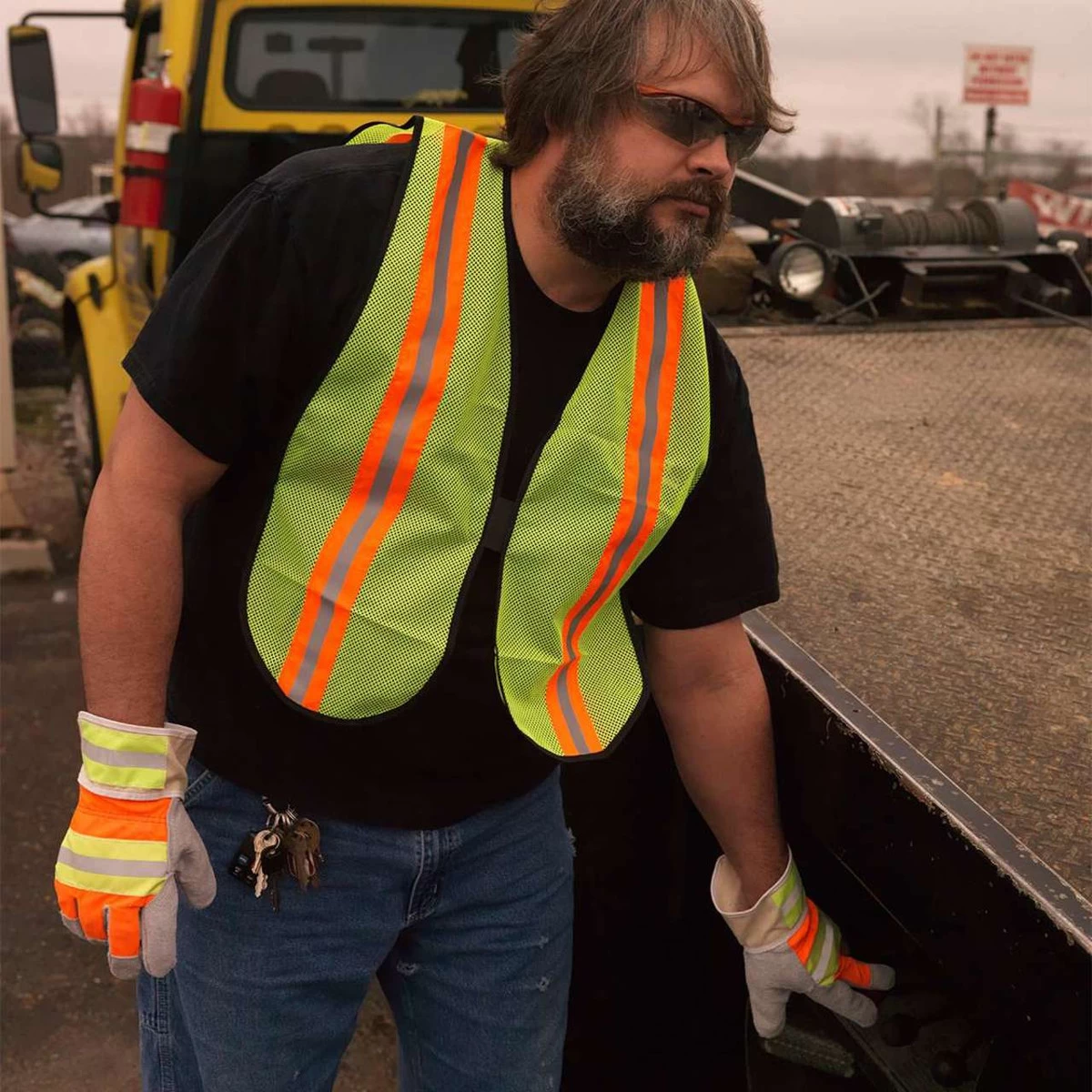 - High visibility orange and lime back with reflective stripes