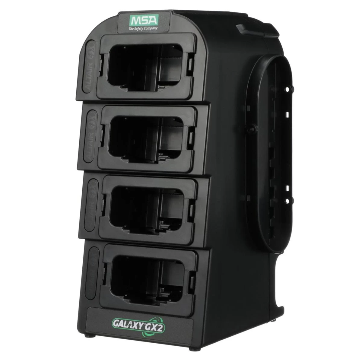 This is the ALTAIR 4/4X Gas Detector Multi-Unit Charger (#10127422) by MSA Safety. This multi-charger can simultaneously charge up to four gas detectors of the ALTAIR 4/4X family. Each Multi-Unit Charger (MUC) contains its own power supply and does not connect electrically to a testing system or testing stand. The MUC housing is designed to physically connect to each other, whether bench-top or wall-mounted (if desired).