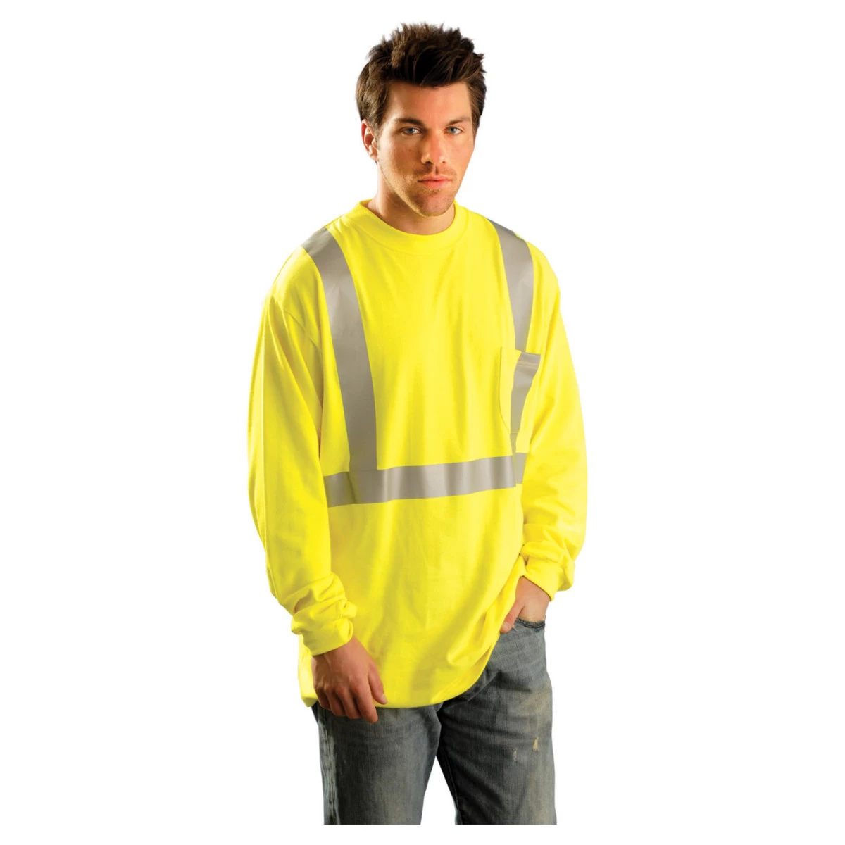 The Occunomix Class 2 High-Vis Flame Resistant Long Sleeve T-Shirt – LUX-LST2/FR is made of a combination of ANSI modacrylic and a cotton/polyester blend. The shirt features reflective stripes on a bright high-visibility yellow color. There is a chest pocket for convenience. Meets ANSI Class 2 ASTMF1506 and is NFPA 70E certified with HRC Level 2.