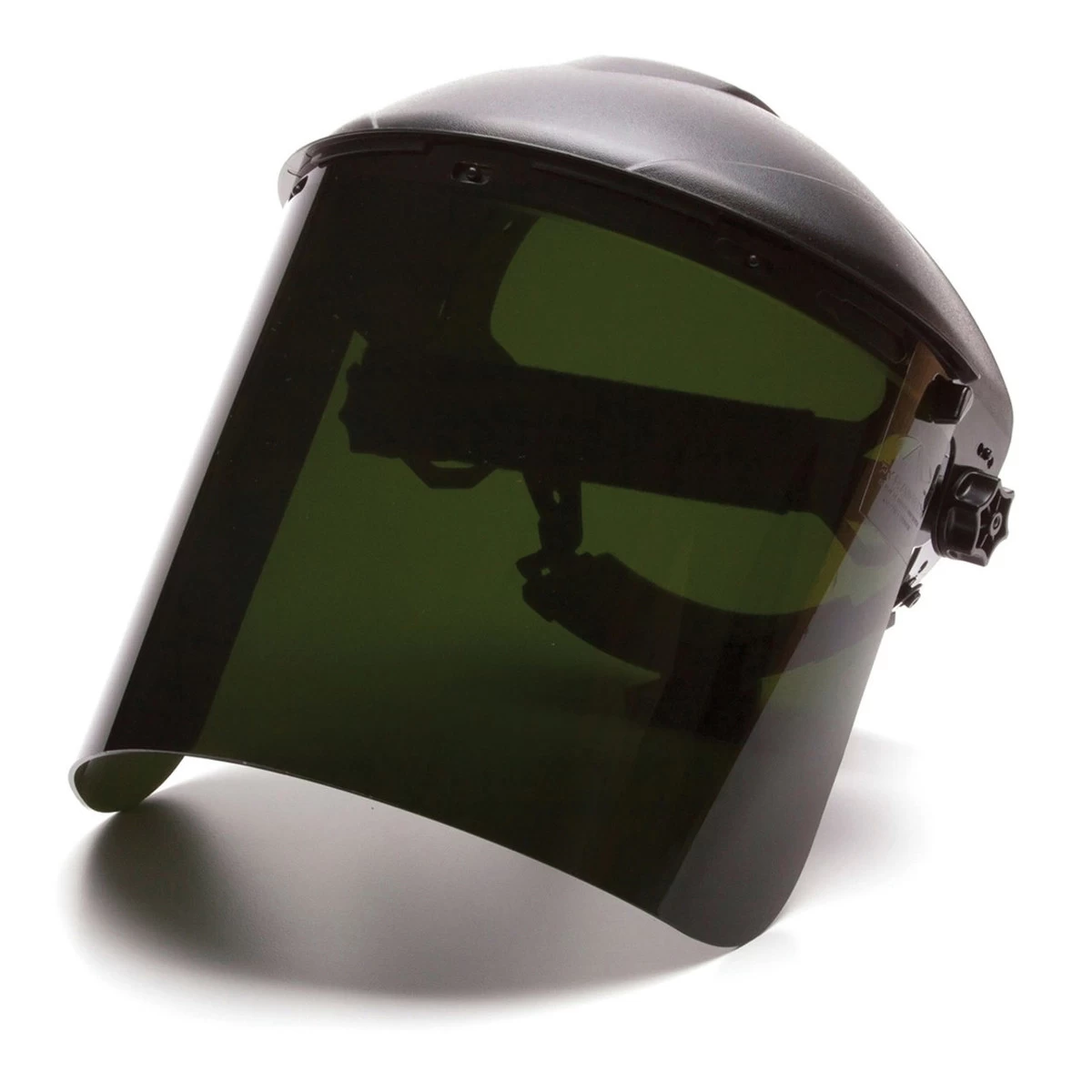 The Pyramex Cylinder IR5 Polycarbonate Face Shield (#S1250) features universal slots to accommodate a large variety of headgear and provides 99% UV protection. This shield meets ANSI Z87+ requirements and is 0.078″ thick. It is a sturdy, durable shield that adds a second layer of protection over glasses or goggles. (You can purchase the HGBR headgear separately that is pictured.)