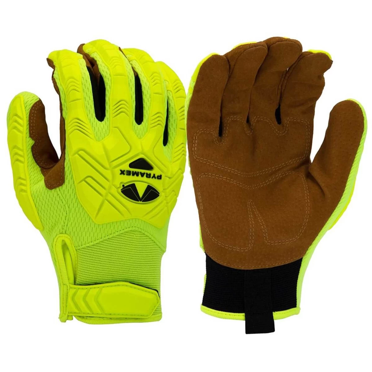 The Pyramex GL202HT Hi-Vis Synthetic Leather Palm Level 1 Impact Gloves offer superior protection and visibility, with features designed for maximum comfort and durability. The gloves feature a genuine leather palm for excellent abrasion resistance and a hi-vis back for enhanced visibility. The secure closure system features a hook and loop with thermoplastic rubber (TPR) wrist closure and a pull tab for easy on/off. The gloves also feature complete TPR impact protection on the thumb, fingers, and knuckles and a mesh stretch fabric back for comfort and breathability. Get the protection you need with the Pyramex GL202HT Hi-Vis Synthetic Leather Palm Level 1 Impact Gloves.