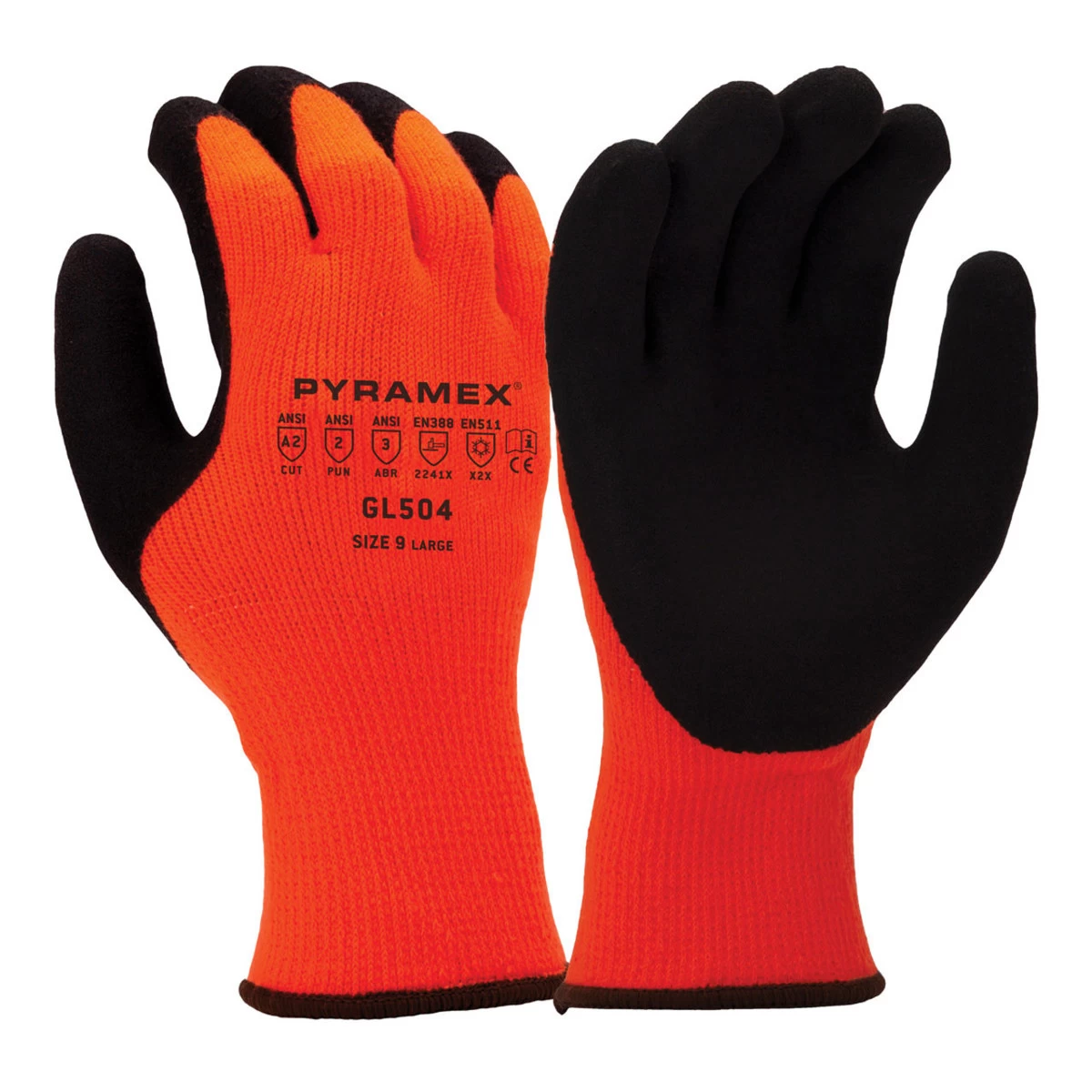 The Pyramex GL504 Hi-Vis Orange Insulated A2 Cut Latex Dipped Gloves protect from contact colds. The insulated dipped glove is made of latex sandy material with a 10 gauge acrylic liner and has an acrylic and latex elastic cuff for a snug and secure fit. The hi-vis color makes them perfect for use in low-light environments. These gloves provide excellent durability, flexibility, and comfort, making them ideal for various applications. The cuff is made from acrylic and latex elastic, ensuring a snug and comfortable fit that won’t slip or slide during use. The Hi-Vis Orange Insulated gloves also offer contact cold protection, making them perfect for freezers, storage facilities, or any other environment where cold temperatures can be a hazard.