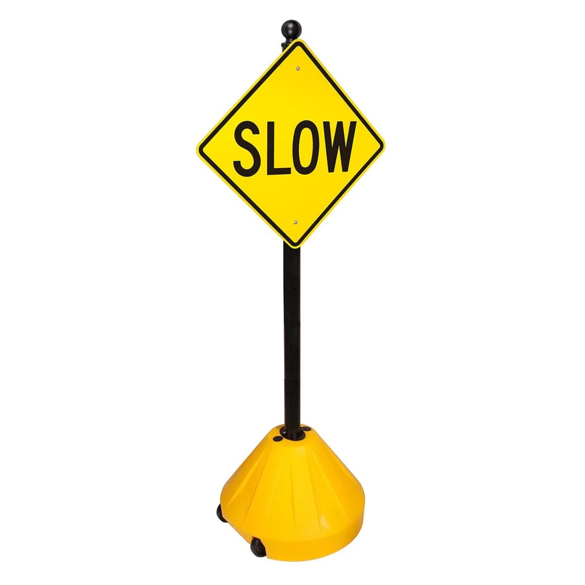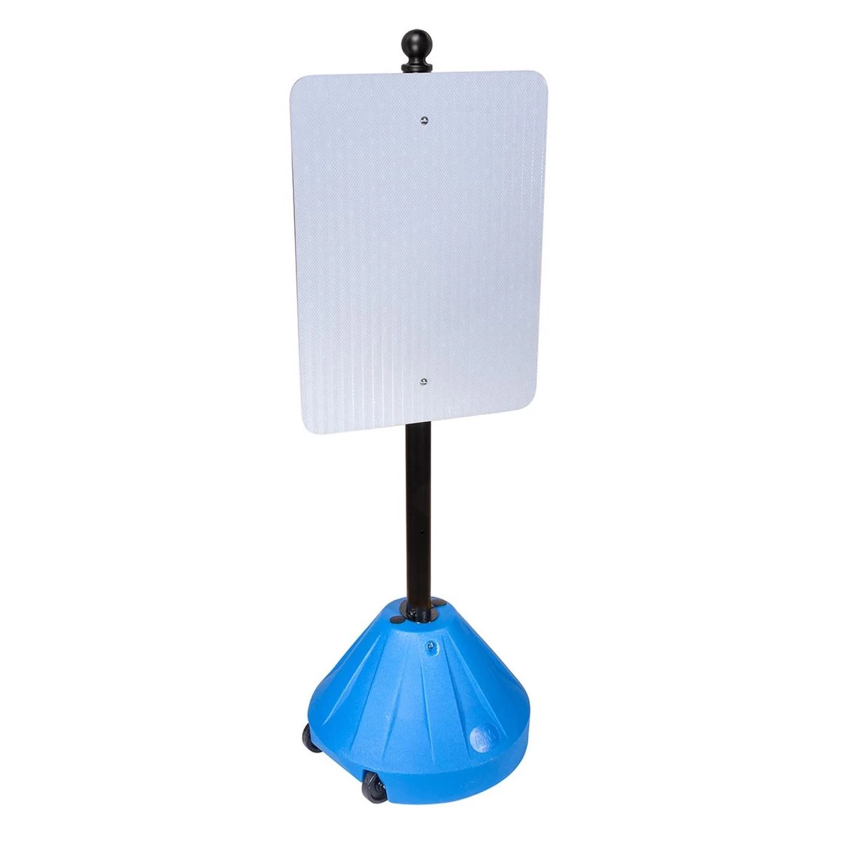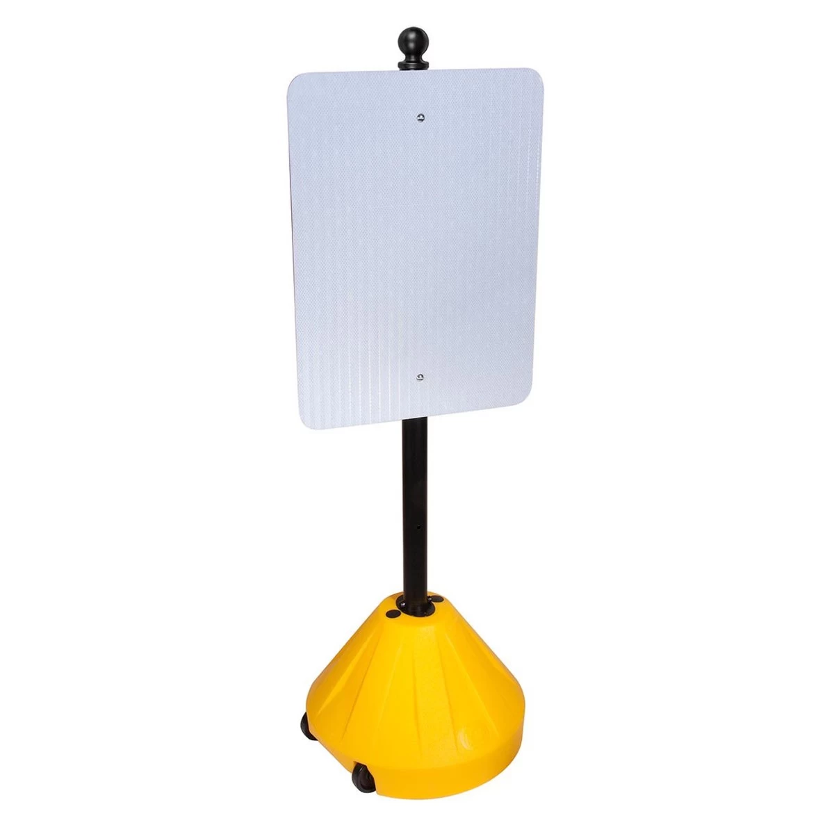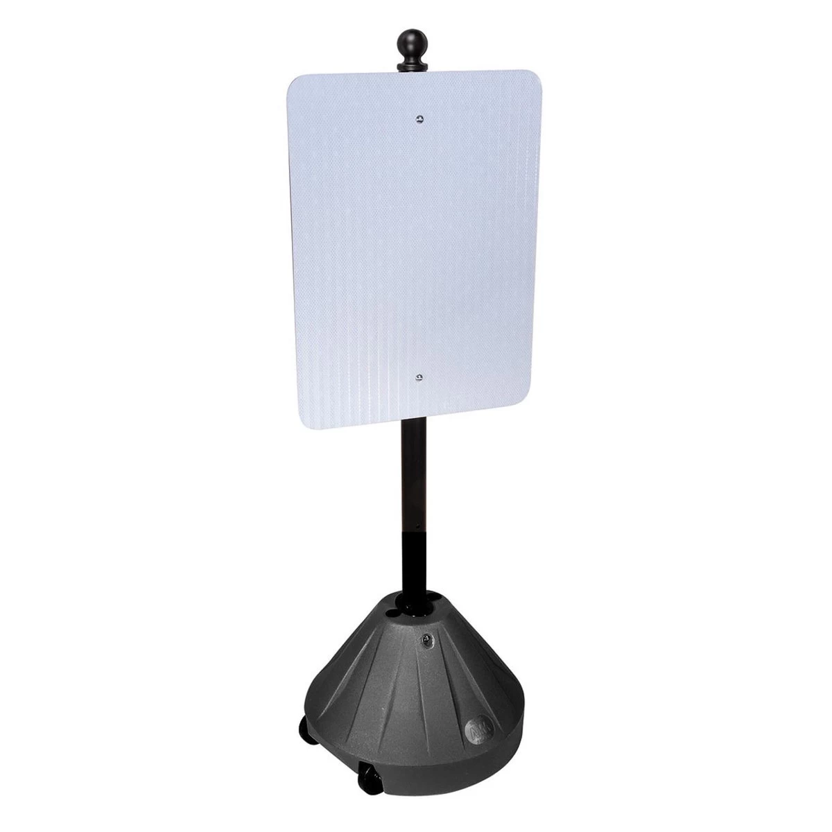 48″ tall Next Generation Rolling Sign Base/Post; Black. Universal sign holder (18″ dia. x 12″ tall) with large recessed 3″ wheels for traffic, parking, safety signs and more; 1 or 2 sided display. Includes 2″ pre-drilled pole that stands 48″ high and accommodates signs from 9″x12″ to 18″x24″ and 12″x36″. Includes exclusive EZ-GRIP Finial and Stability Plates that keep signs from twisting on post. Rolling water or sand filled base for stability and wind resistance holds up to 30+ lbs of ballast; just Grip, Tip and Roll to move in or out; user stays clean and dry. Base comes in Black, Red, Blue or Yellow.