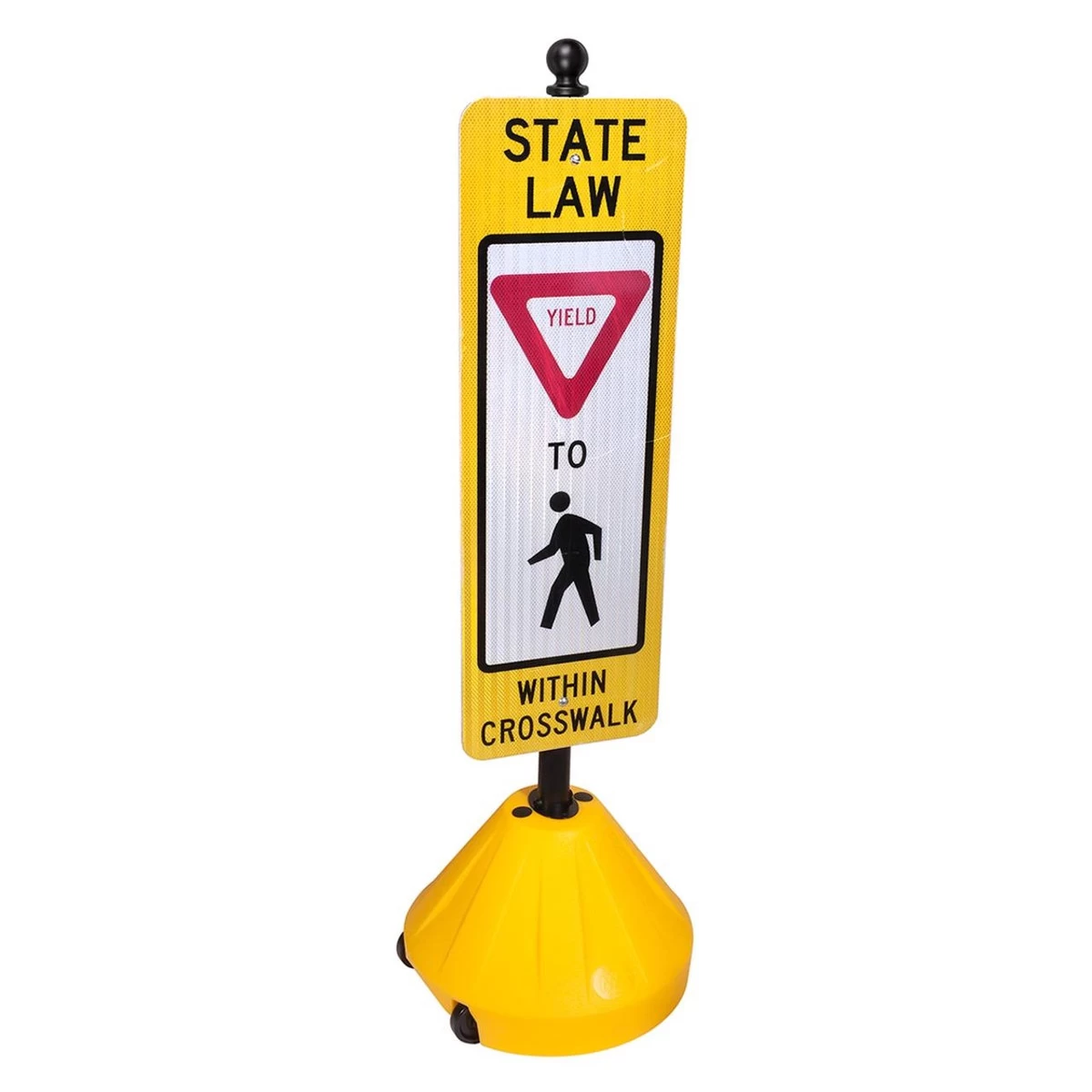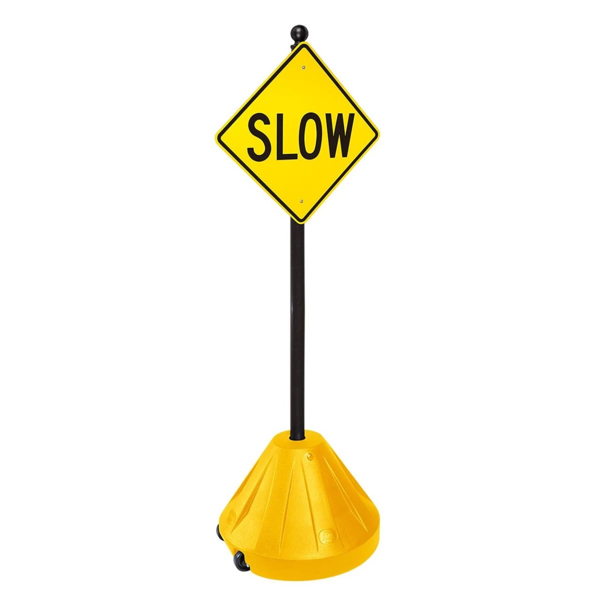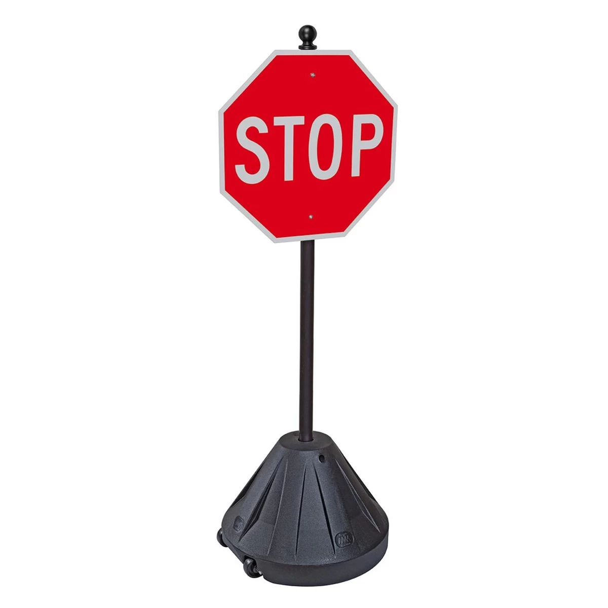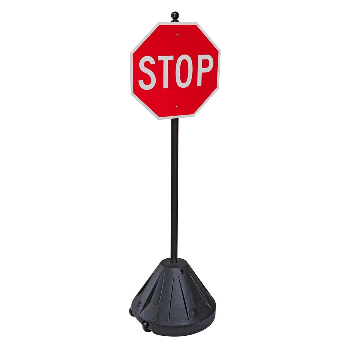 Large format Next Generation Rolling Sign Base/Post; Black. Universal sign holder (24″ dia. x 16″ tall) with large, heavy duty, recessed 3″ wheels for traffic, parking, safety signs and more; 1 or 2 sided display. Includes 2″ pre-drilled pole accommodates signs from 9″x12″ to 18″x24″ and 12″x36″. Includes exclusive EZ-GRIP Finial and Stability Plates that keep signs from twisting on post. Rolling water or sand filled base for stability and wind resistance holds up to 70+ lbs. of ballast; just Grip, Tip, and Roll to move in or out; user stays clean and dry. Base comes in Black or Yellow.
